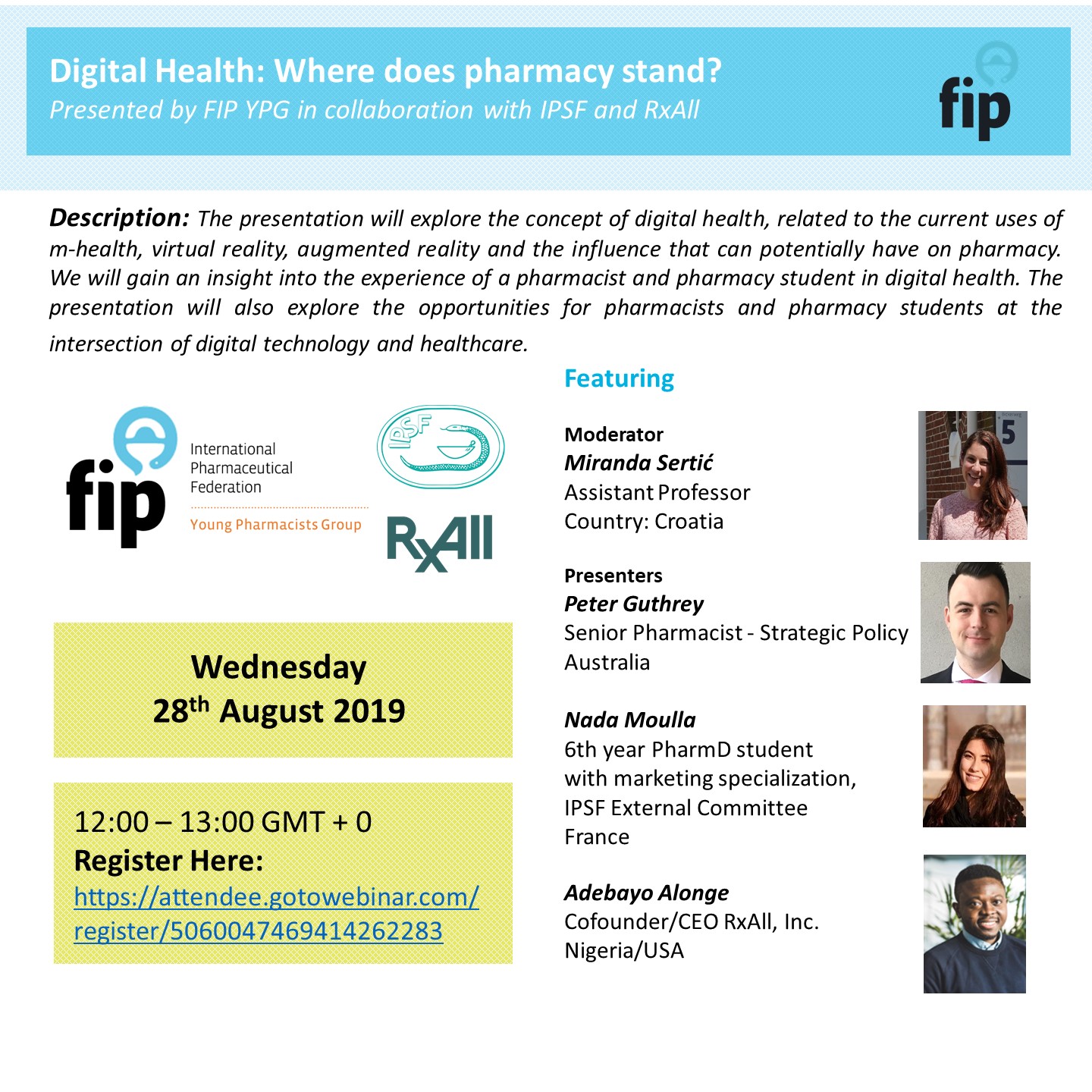 Topics such as m-health in pharmacy and application of virtual and augmented reality will be covered by pharmacists and pharmacy students with experience in digital health applications.