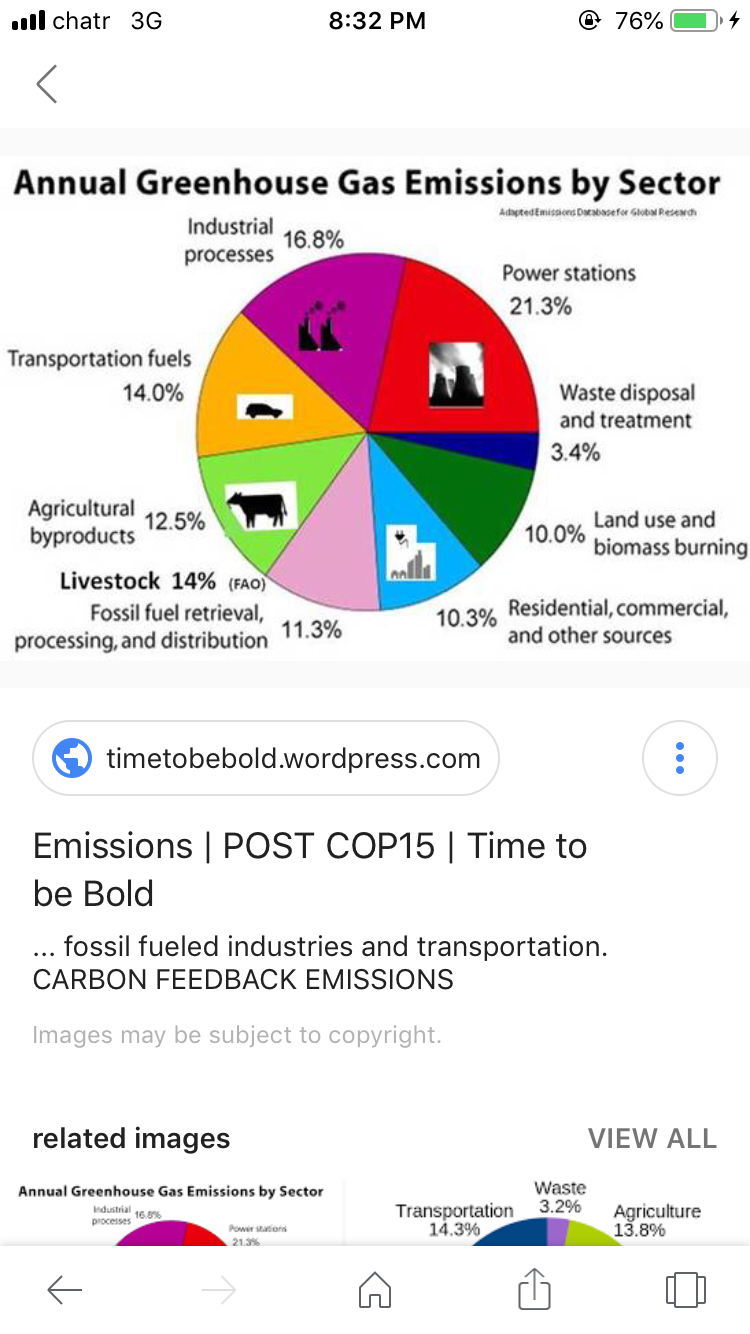 For example ‘transformationists’ smirk while proponents of the mitigation approach rail against fossil fuels for causing CO2 emissions. They are furious that ‘mitigationists’ ignore an even more serious cause of CO2 emissions and global warming- this is the Meat, Dairy, Cattle and agriculture industry. This industry is responsible for 35% of Green house emissions vs. 11% from the fossil fuel industry. See chart below-