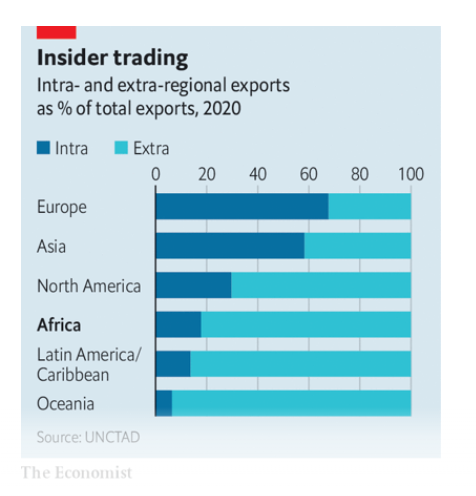 Firstly, intra-Africa trade (15.2%) is arguably low compared to other regions such as America (47%), Asia (61%), Europe (67%), Oceania (7%)(4) therefore Africa will see more of an economic boost if it can grow its share of trade within Africa as against trying to increase trade with the EU for example with which it already has developed extensive trade relationships going back centuries. By focusing on intra-Africa trade, it will also be able to build more resilience into its local market economies which today tend to suffer a lot of volatility due to over-reliance on commodity exports to extra-Africa trade partners as the EU.